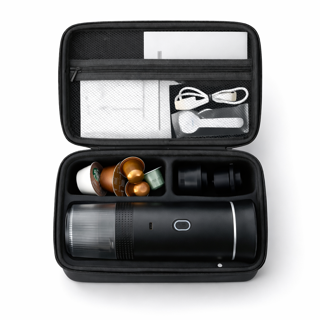 Odolné a kompaktní pouzdro, které chrání váš přenosný espresso kávovar i příslušenství při cestování. Vnitřní výstelka tlumí nárazy a udržuje vše bezpečně na svém místě – ideální do práce, auta i na cesty.